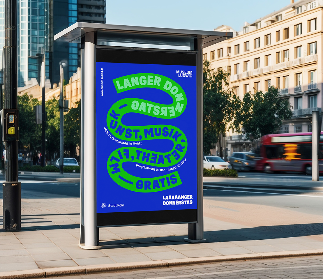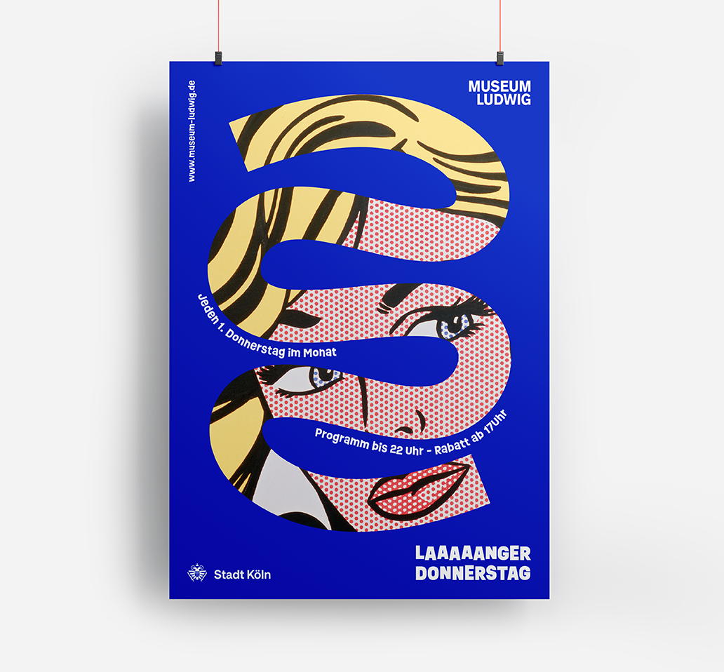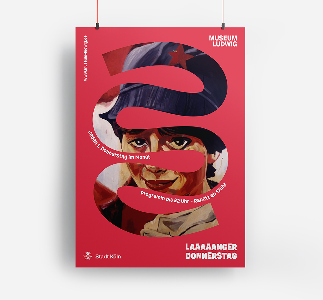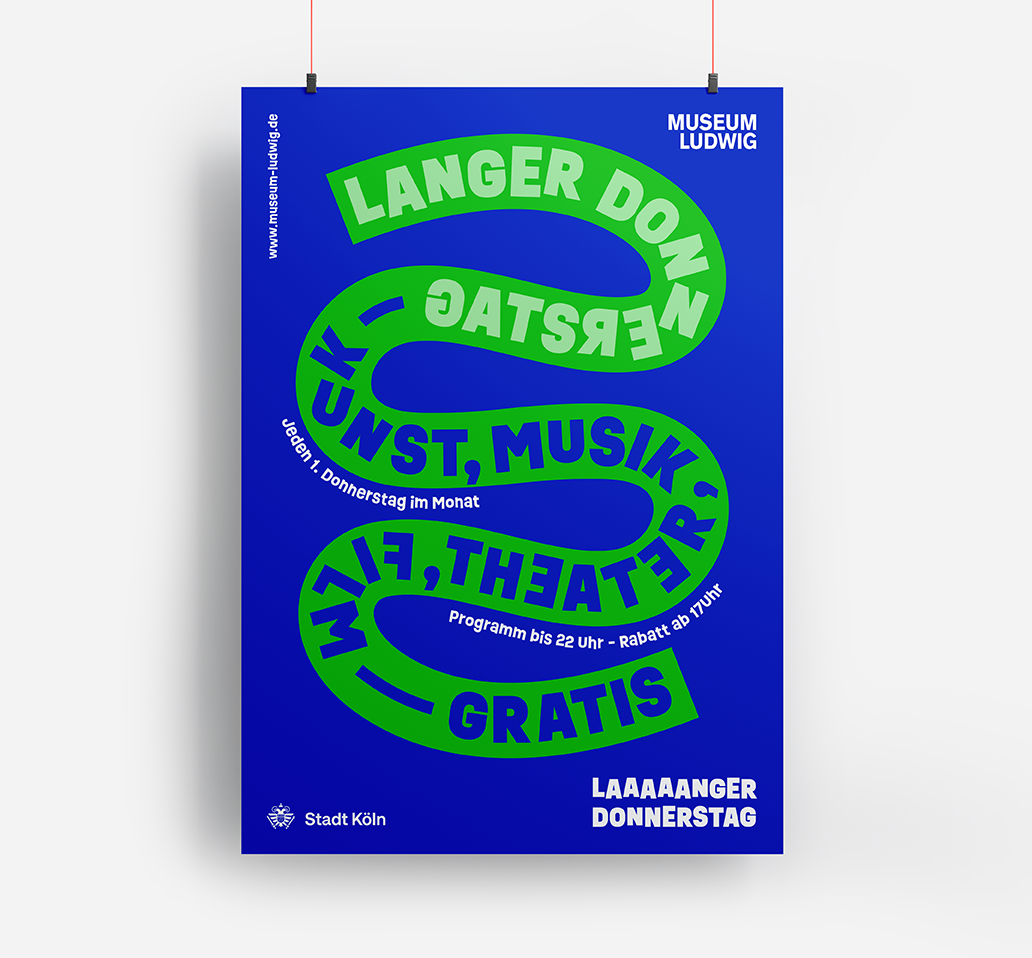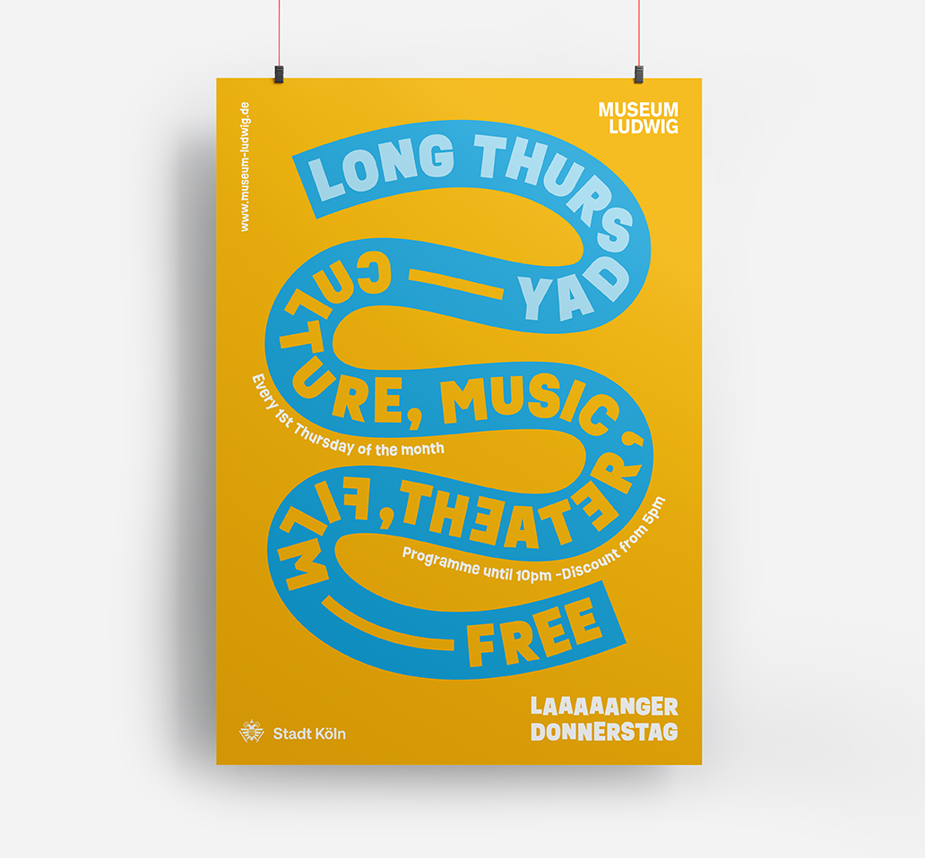 This was a Masters project at KISD (Köln International School of Design), where we worked together with the Ludwig Museum for the event concept Langer Donnerstag (Long Thursday). On the first Thursday of every month, numerous galleries, museums, art venues and cultural sites in the city open their doors until the evening hours free of charge for Cologne (Germany) residents. The project intended that we updated the museum’s communication for the event, considering posters, social media and physical materials for the space.