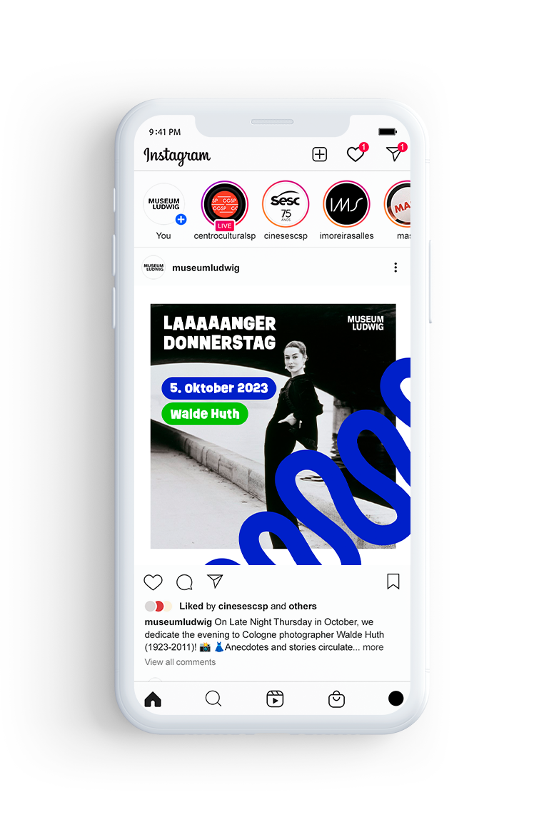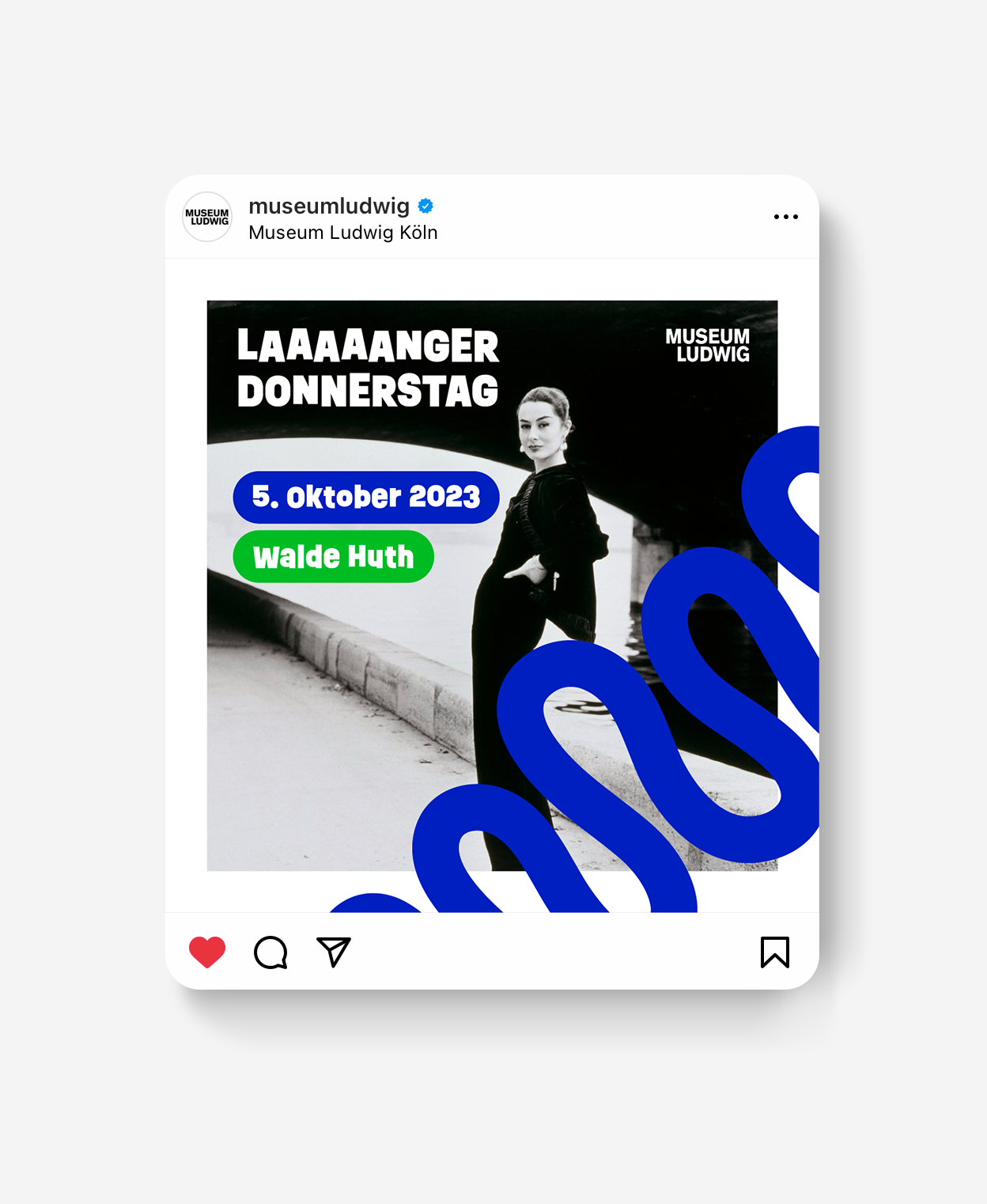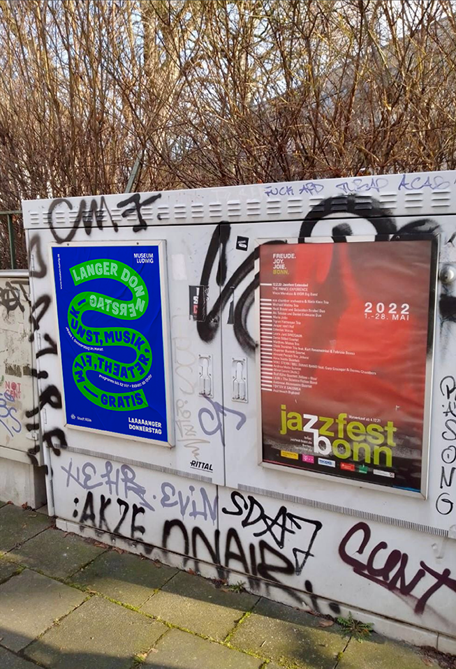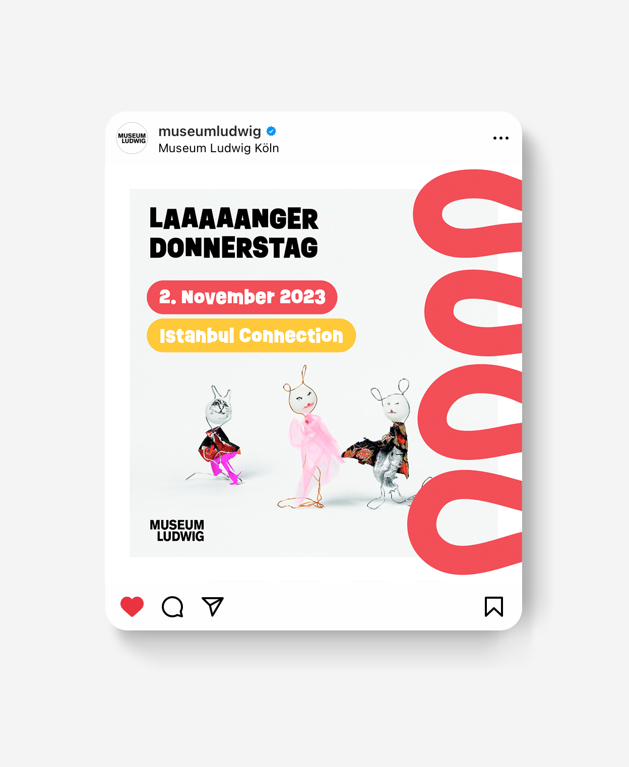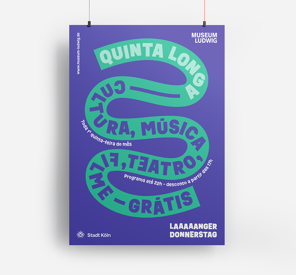 This was a Masters project at KISD (Köln International School of Design), where we worked together with the Ludwig Museum for the event concept Langer Donnerstag (Long Thursday). On the first Thursday of every month, numerous galleries, museums, art venues and cultural sites in the city open their doors until the evening hours free of charge for Cologne (Germany) residents. The project intended that we updated the museum’s communication for the event, considering posters, social media and physical materials for the space.