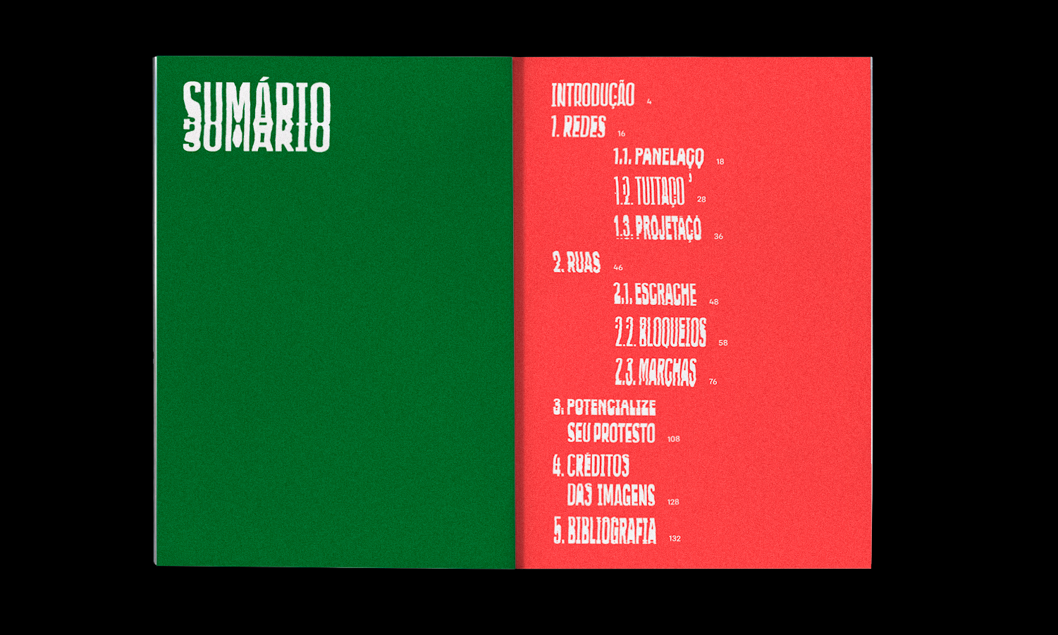 The book was produced as a thesis for a Bachelor's Degree in Design at the Faculty of Architecture, Urbanism and Design of the University of São Paulo (FAUUSP). It has 140 pages, 14 x 20 cm in size, printed in offset paper 90g/m2 (93.75% utilisation of BB size paper) and includes one of the 5 posters created for the chapter Boost your protest.