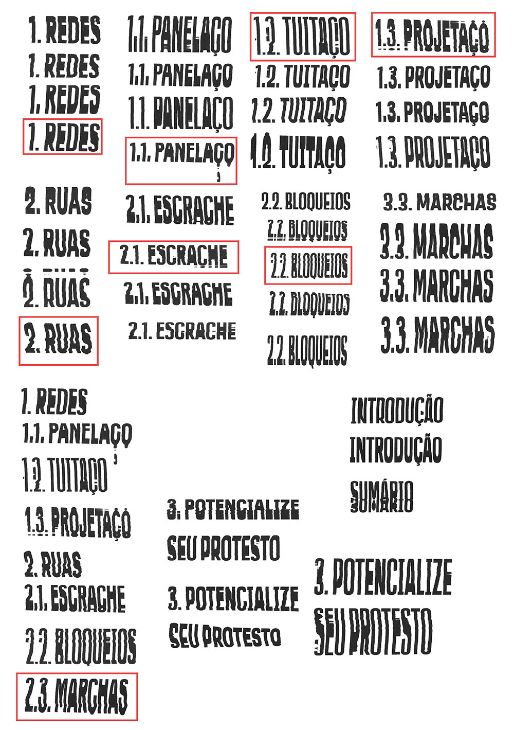 3. Boost your protest: The book concludes that protests can be boosted by understanding their actions and realising that modalities are forms that can be combined, mixed, adapted and consequently intensified to achieve a high level of impact. In the context of a design thesis, it was decided to produce a text explaining some of the steps that should be taken when producing a graphic work, with examples, and an open call for readers to collaborate via a collective public folder for uploads and downloads, creating a network of mobilised people.