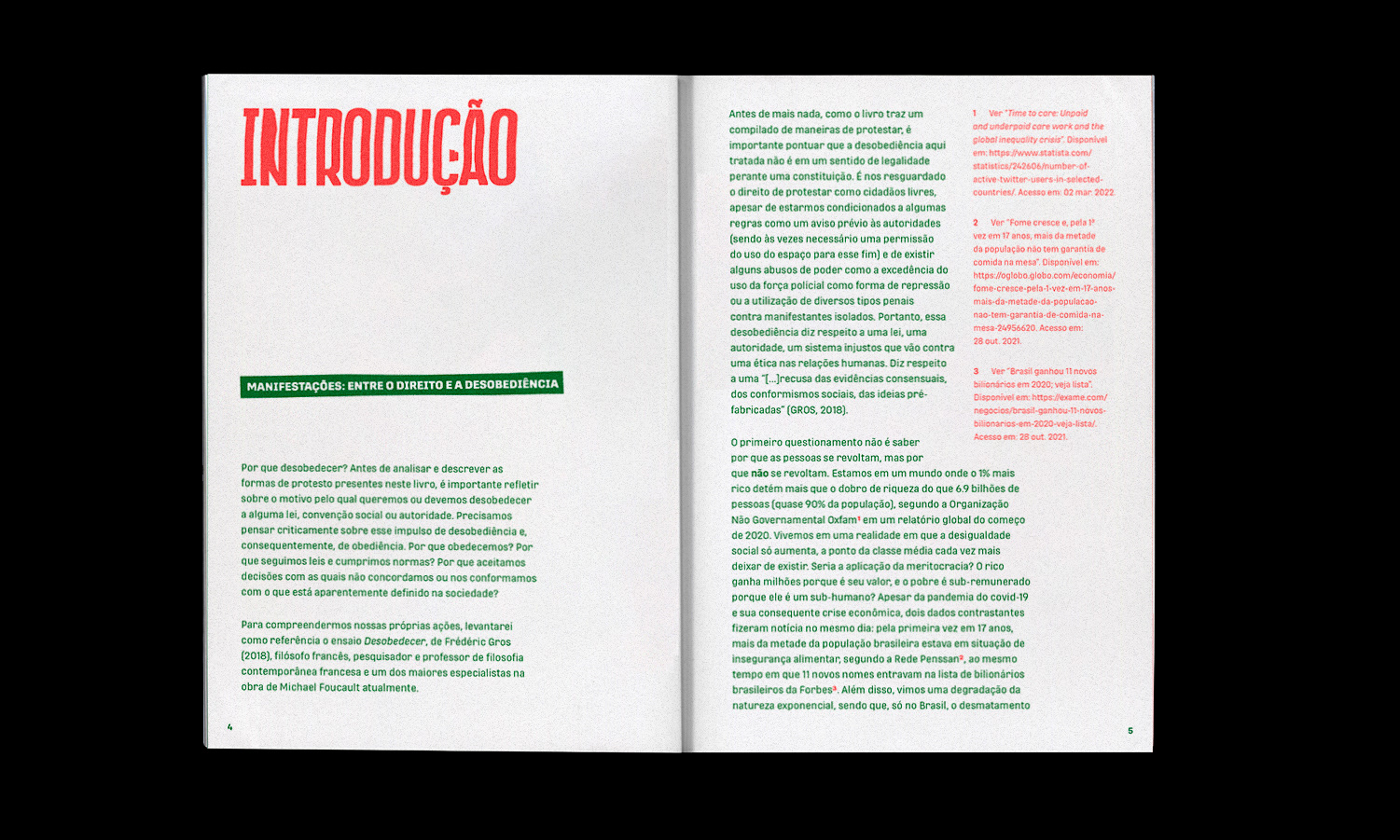 1. Introduction: divided into two texts, Demonstrations: between right and disobedience and Practical activism and the rebel city, the introduction served to discuss with the reader what the act of protest is, based on the idea of disobedience (Disobey! A Philosophy of Resistance by Frédéric Gros, 2018) and the practical consequences of a protest on the system (Rebel Cities: From the Right to the City to the Urban Revolution by David Harvey, 2014; Read & Riot: A Pussy Riot Guide to Activism by Nadya Tolokonnikova, 2019 and Thoreau's thoughts on the relationship between critical theory and practical action - presented by Gros, 2018).