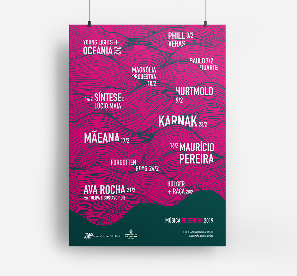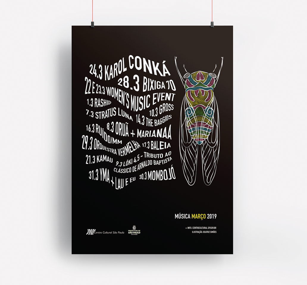 Posters to promote the music programme at the São Paulo Cultural Centre (CCSP) in February and March 2019. In both posters, the concept was to incorporate elements related to music and sound. In the first, the idea was to abstract sound waves and relate them to the waves of the sea. The second alludes to the fable "The Ant and the Cicada", using the cicada as a musical element.