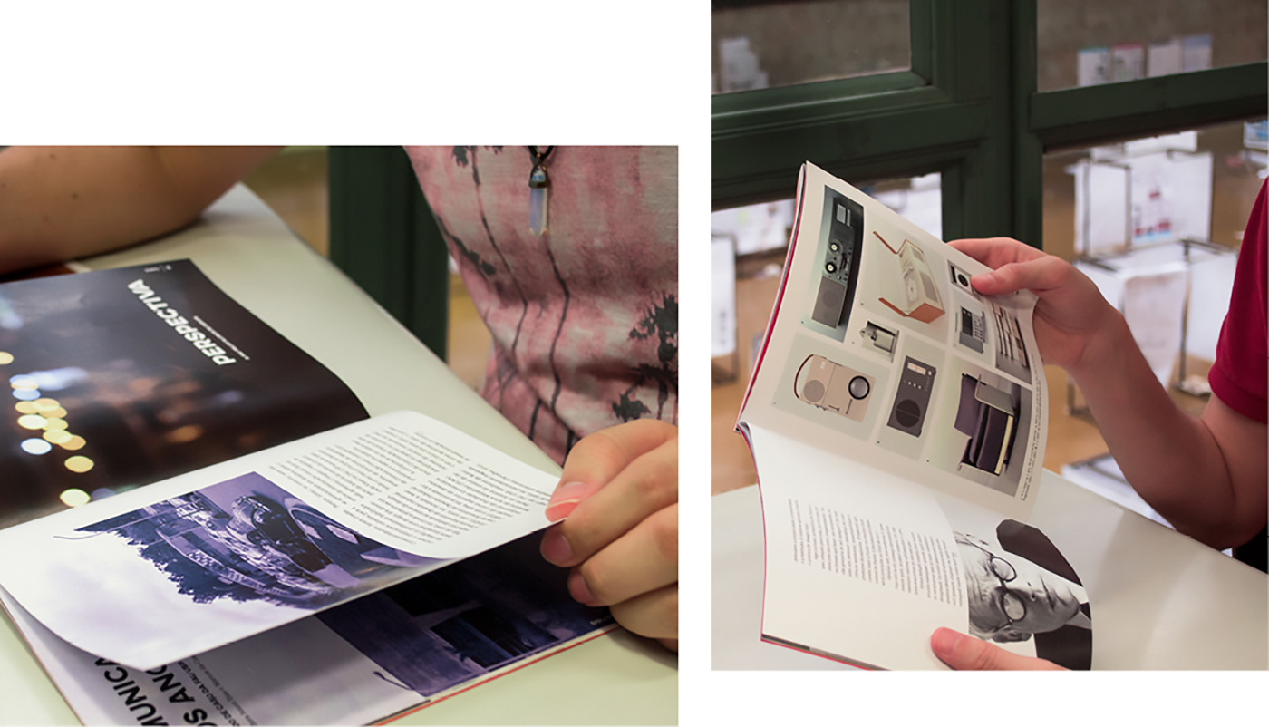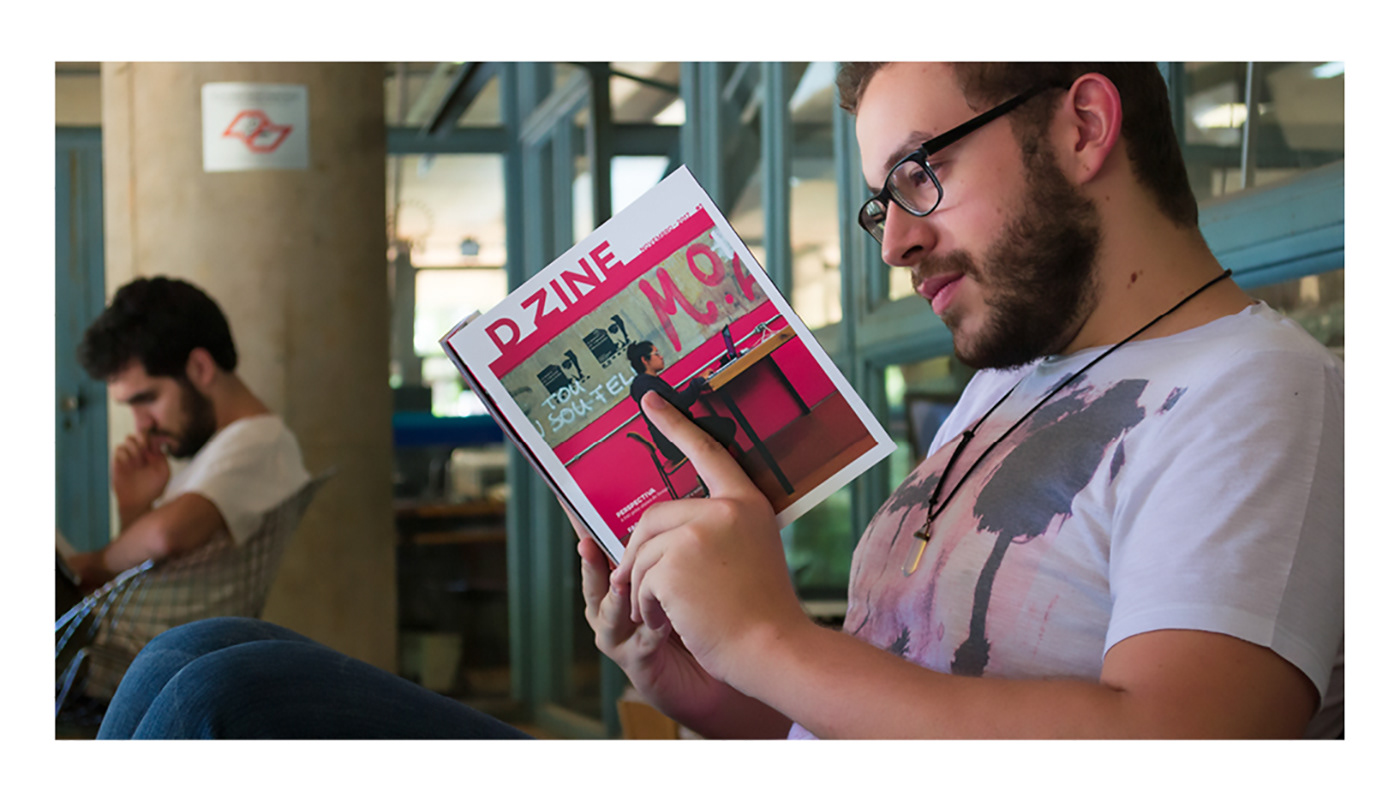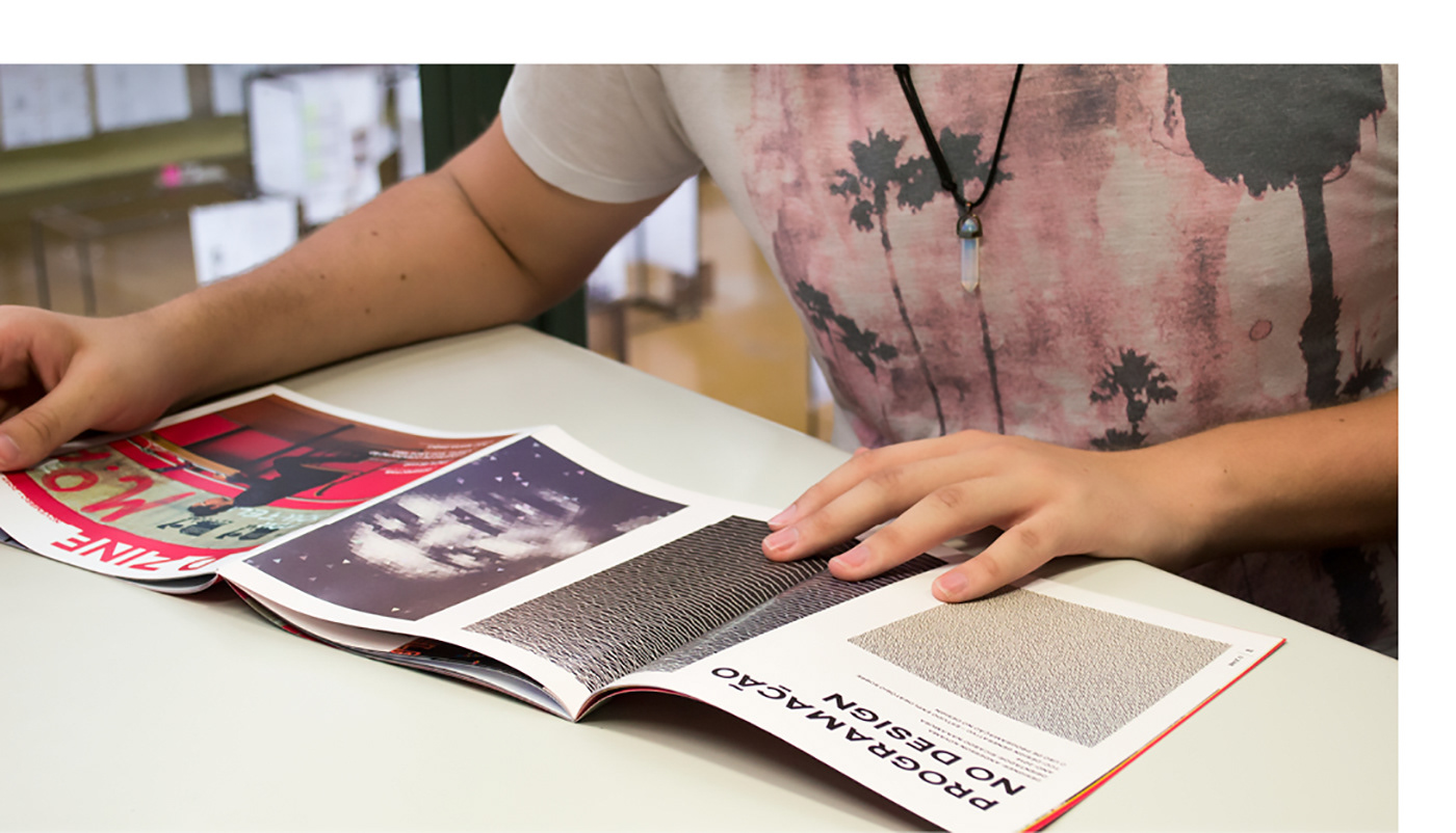 The magazine has a "Z" format, so two brochures can be attached in the cover. This format separates the two major contents of the magazine: design inside the university and design in the outside world. It also creates a dialogue between the shape and the name of the magazine D ZINE.