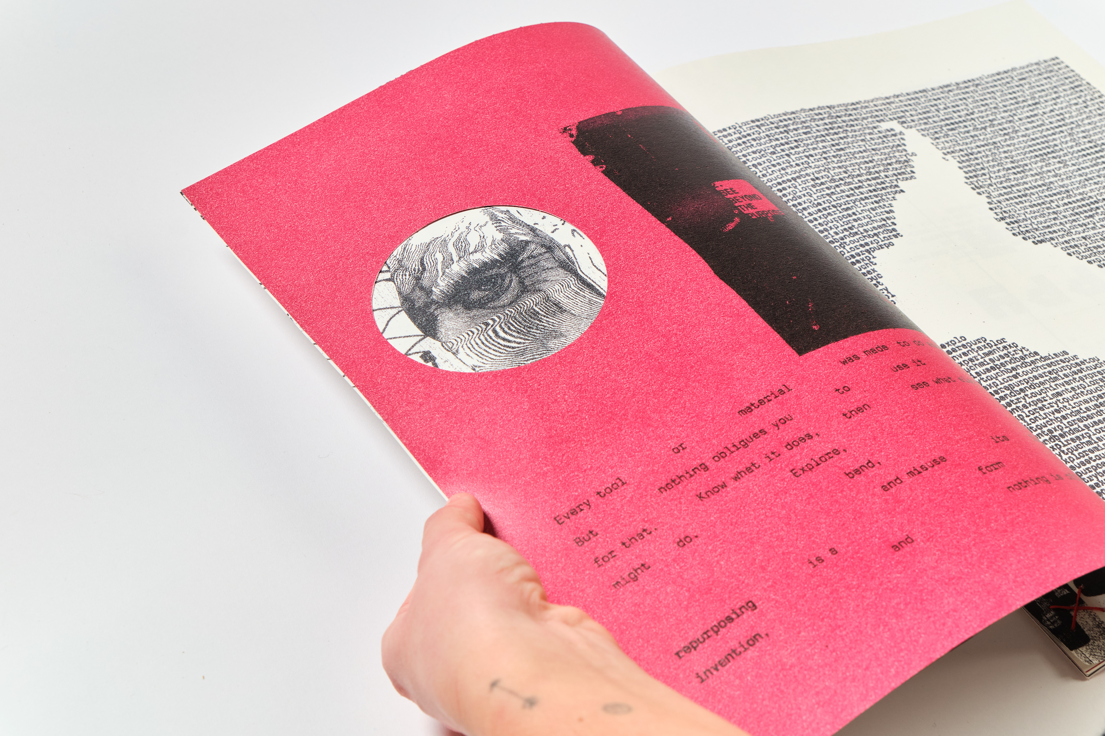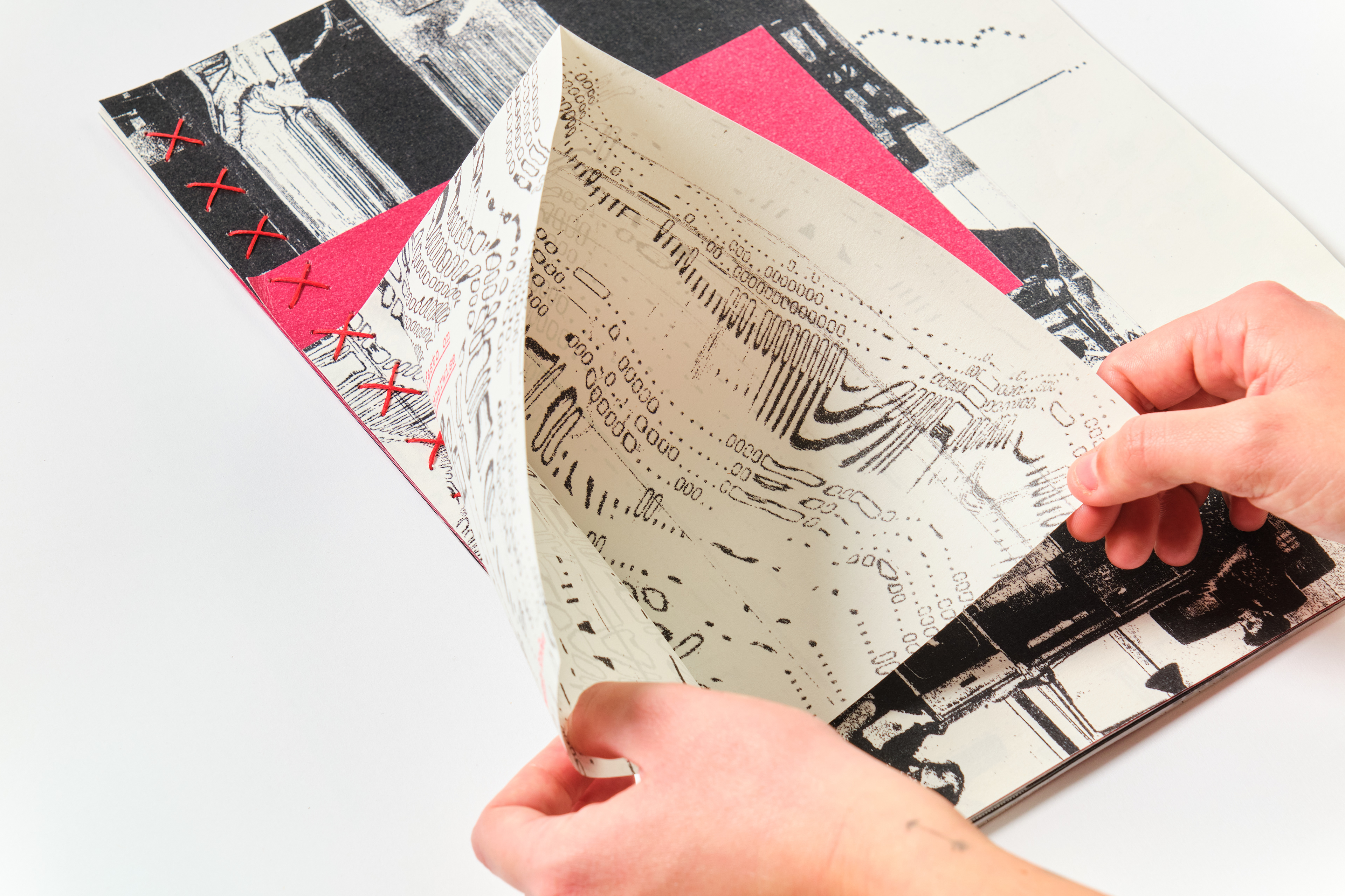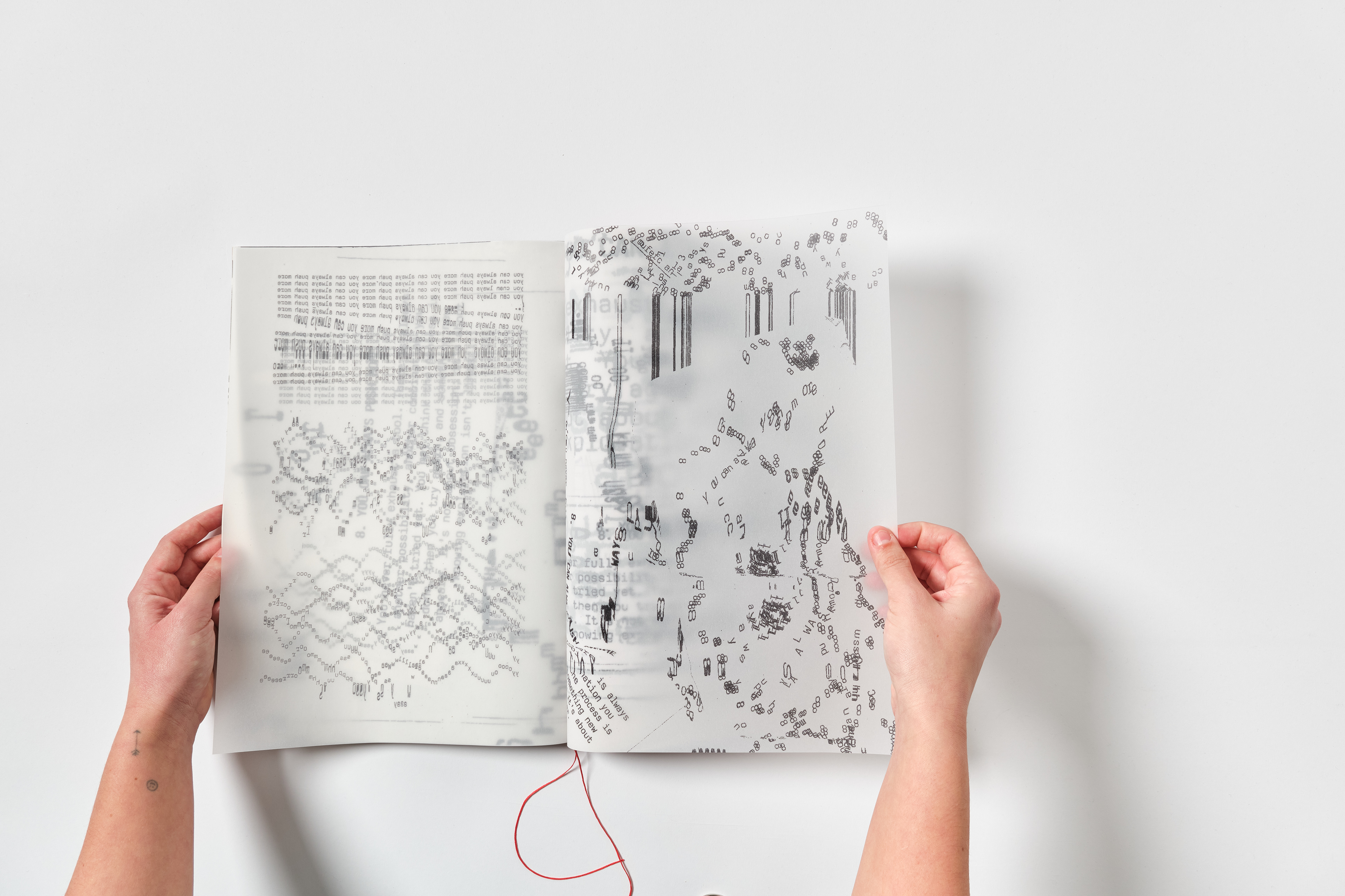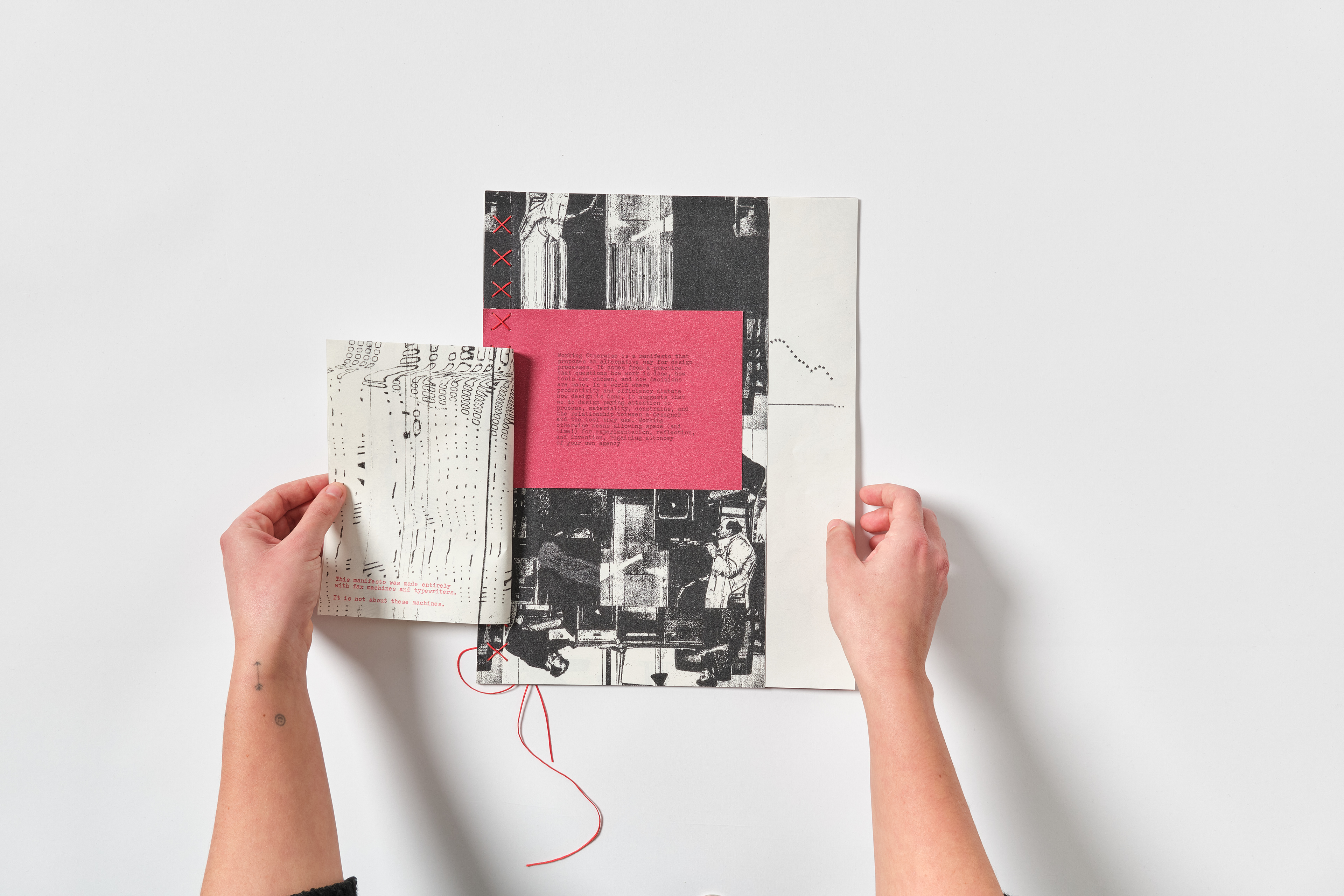 Keeping the hands-on-approach of the project, the pages were bound together manually, using the Japanese stab binding technique. The color of the thread connects to the color accent of the manifesto: red, the only additional color the machines could produce besides black.
