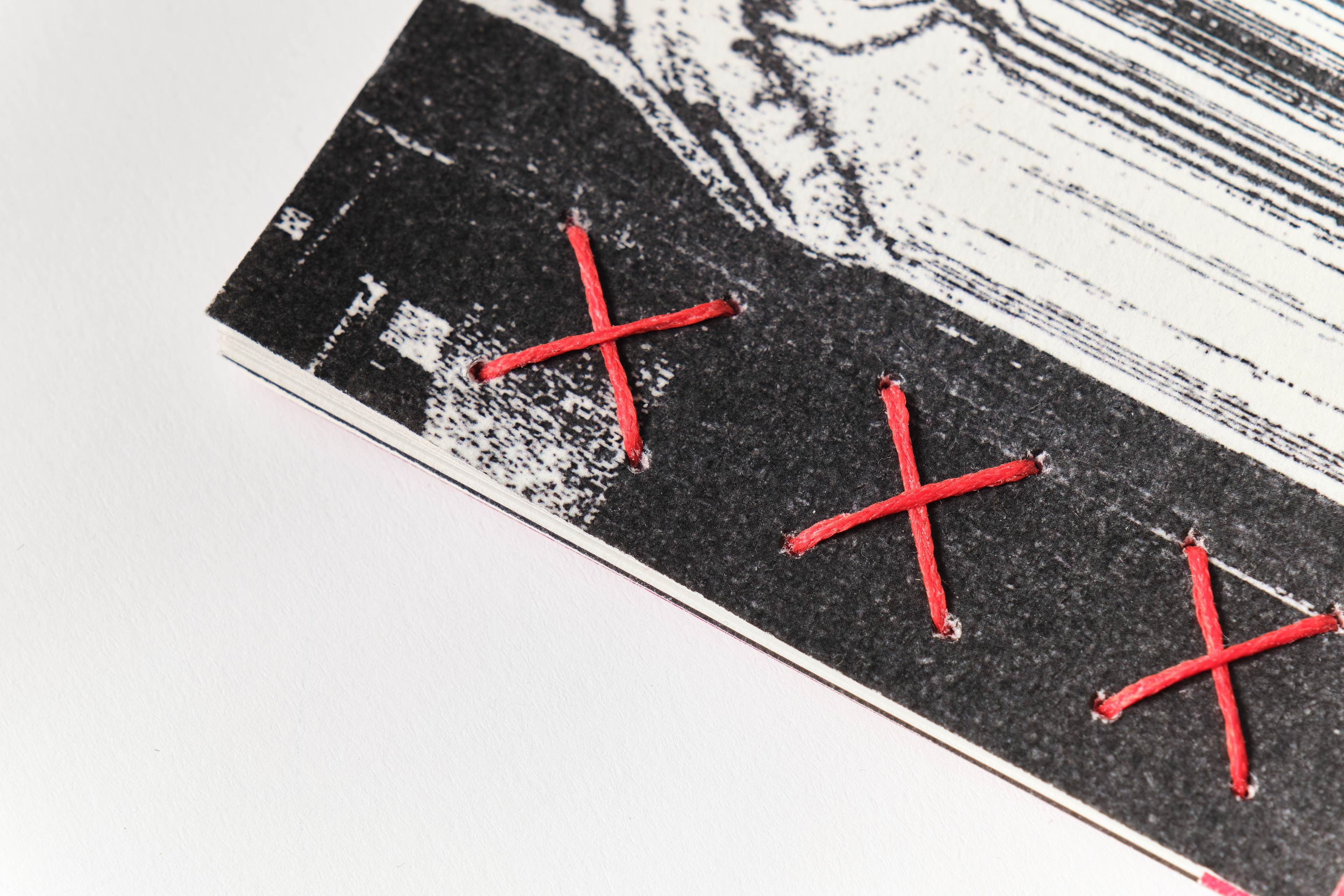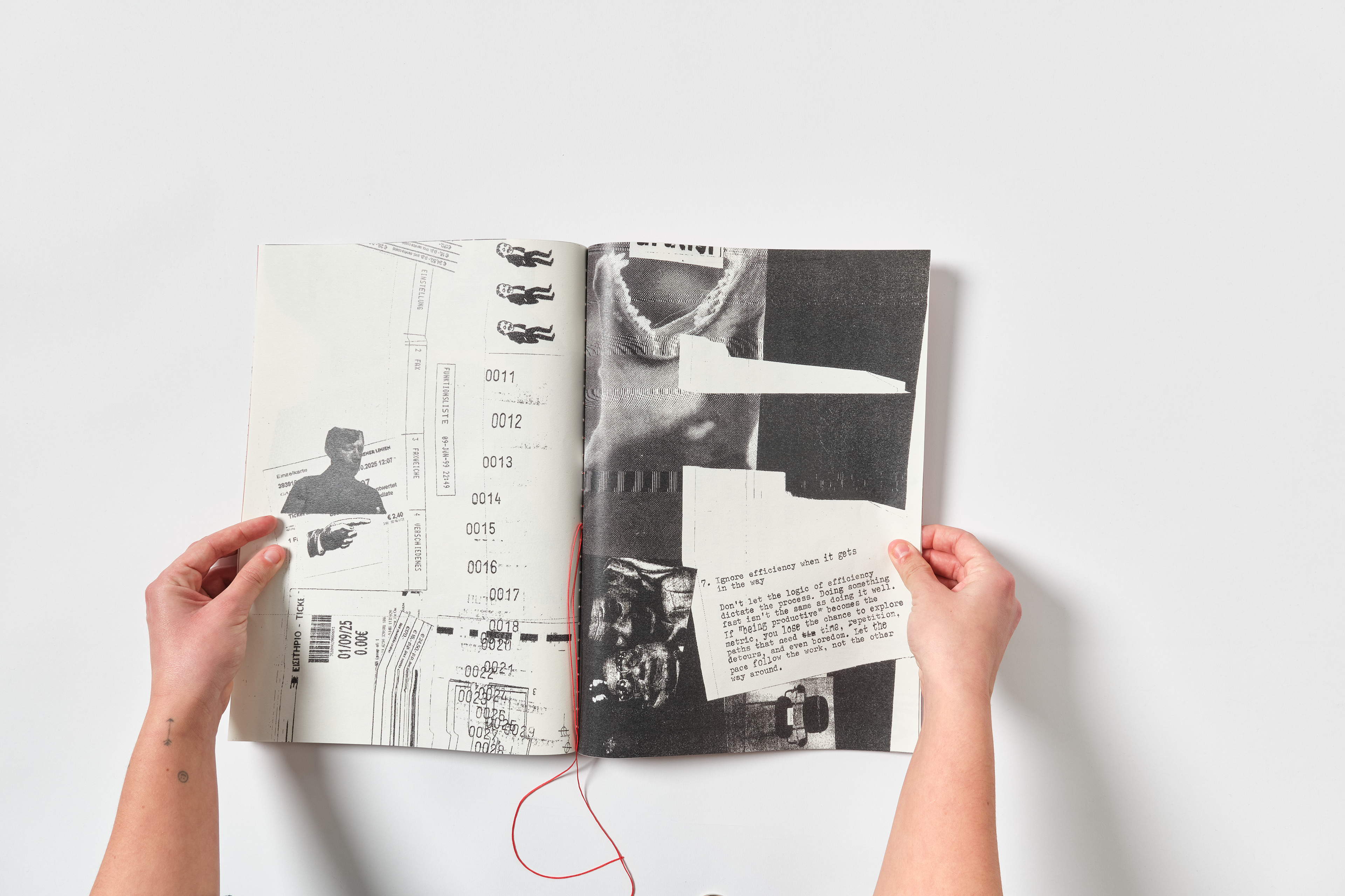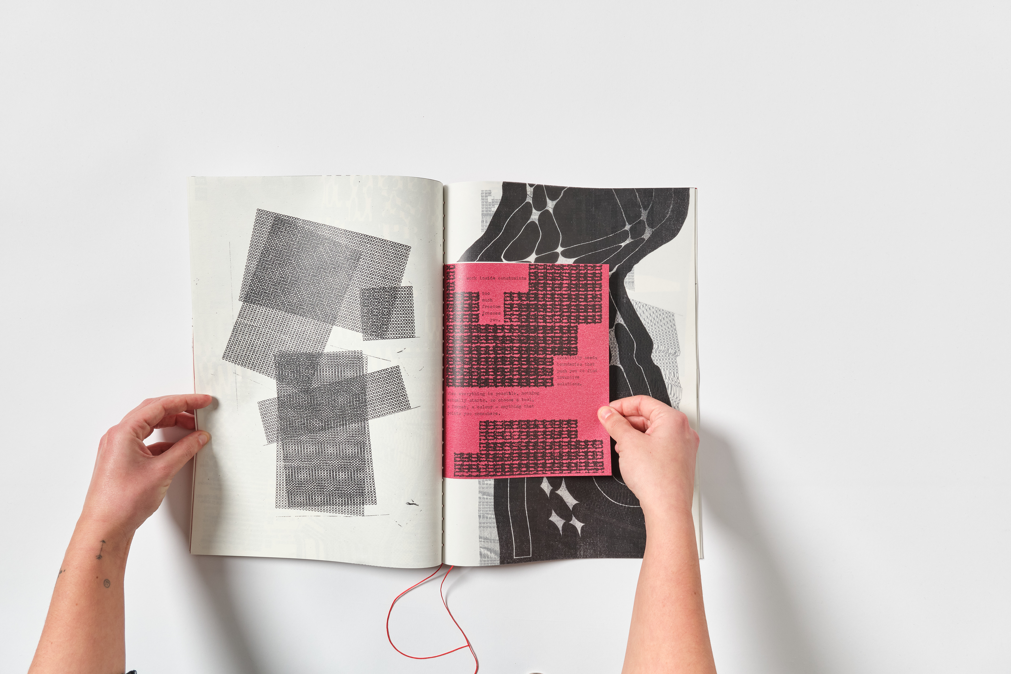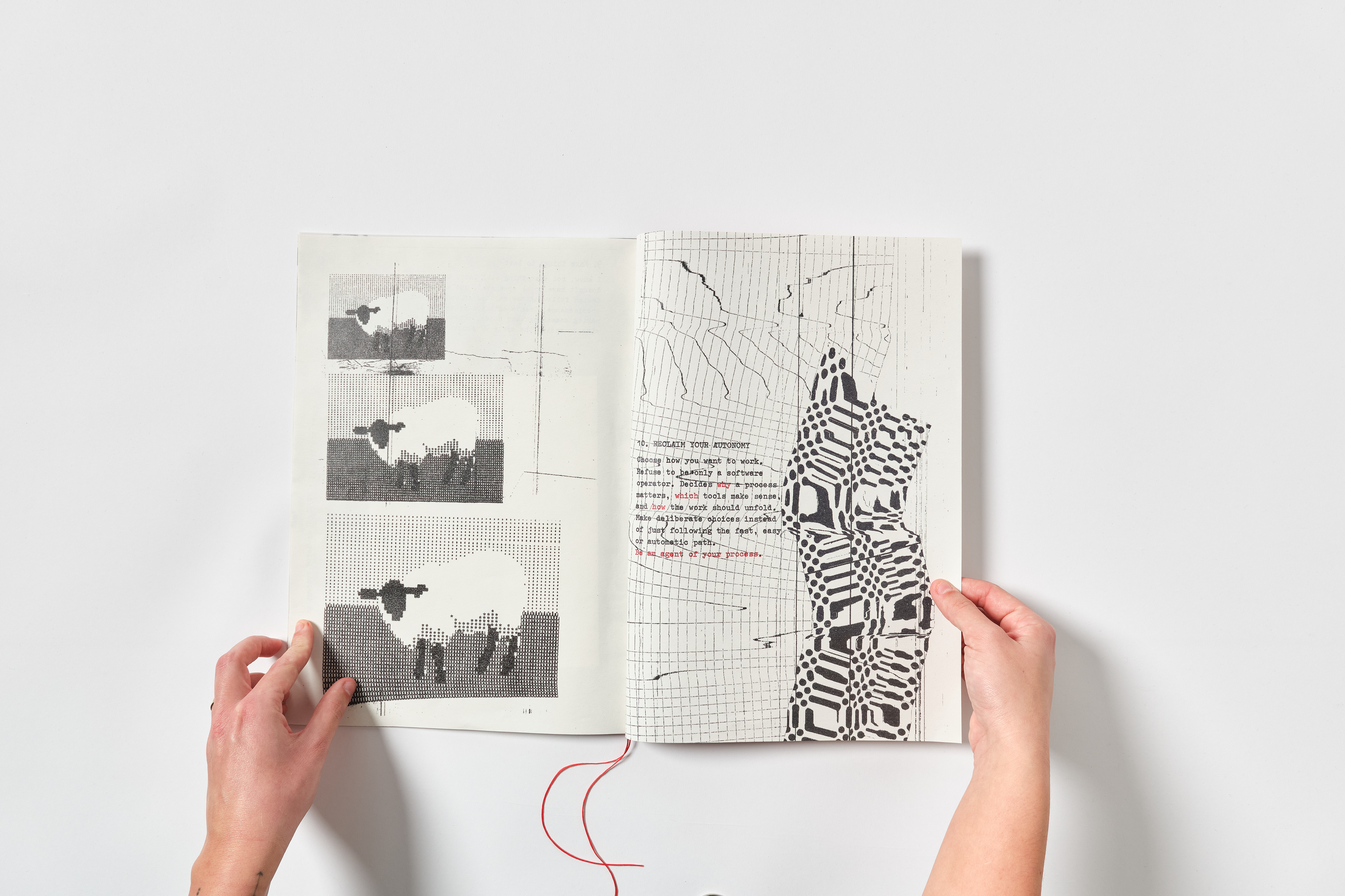 Keeping the hands-on-approach of the project, the pages were bound together manually, using the Japanese stab binding technique. The color of the thread connects to the color accent of the manifesto: red, the only additional color the machines could produce besides black.