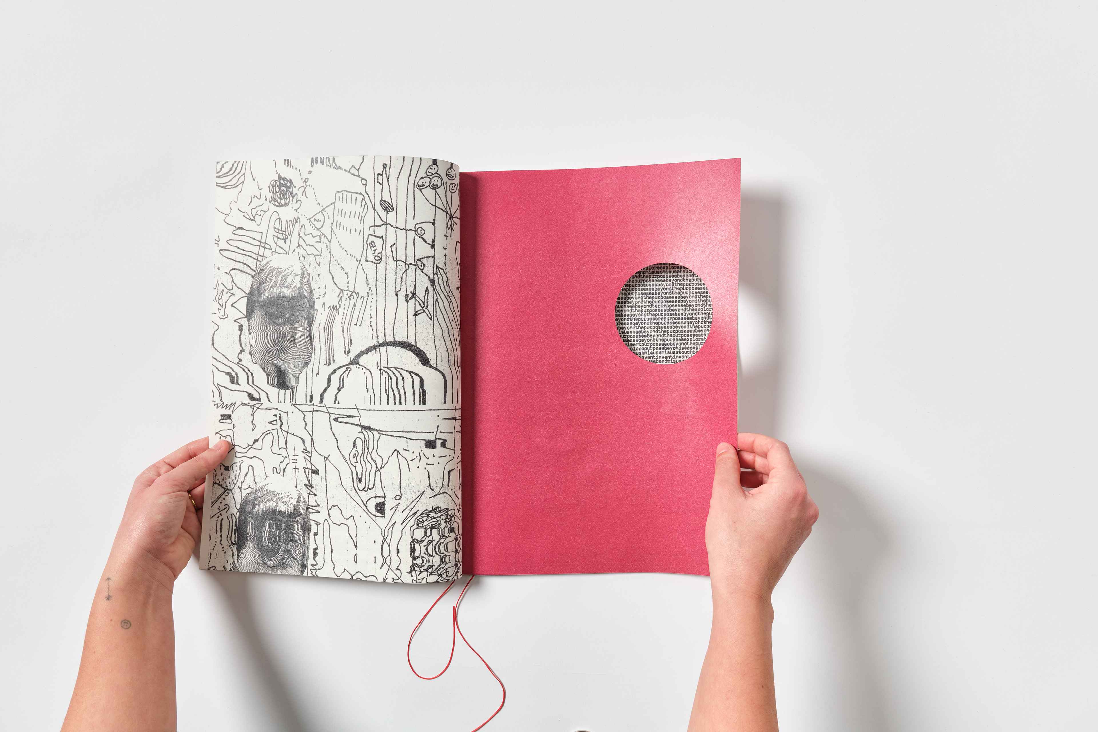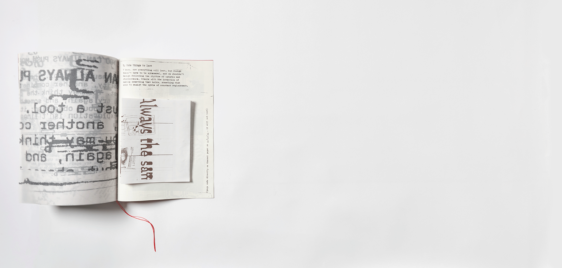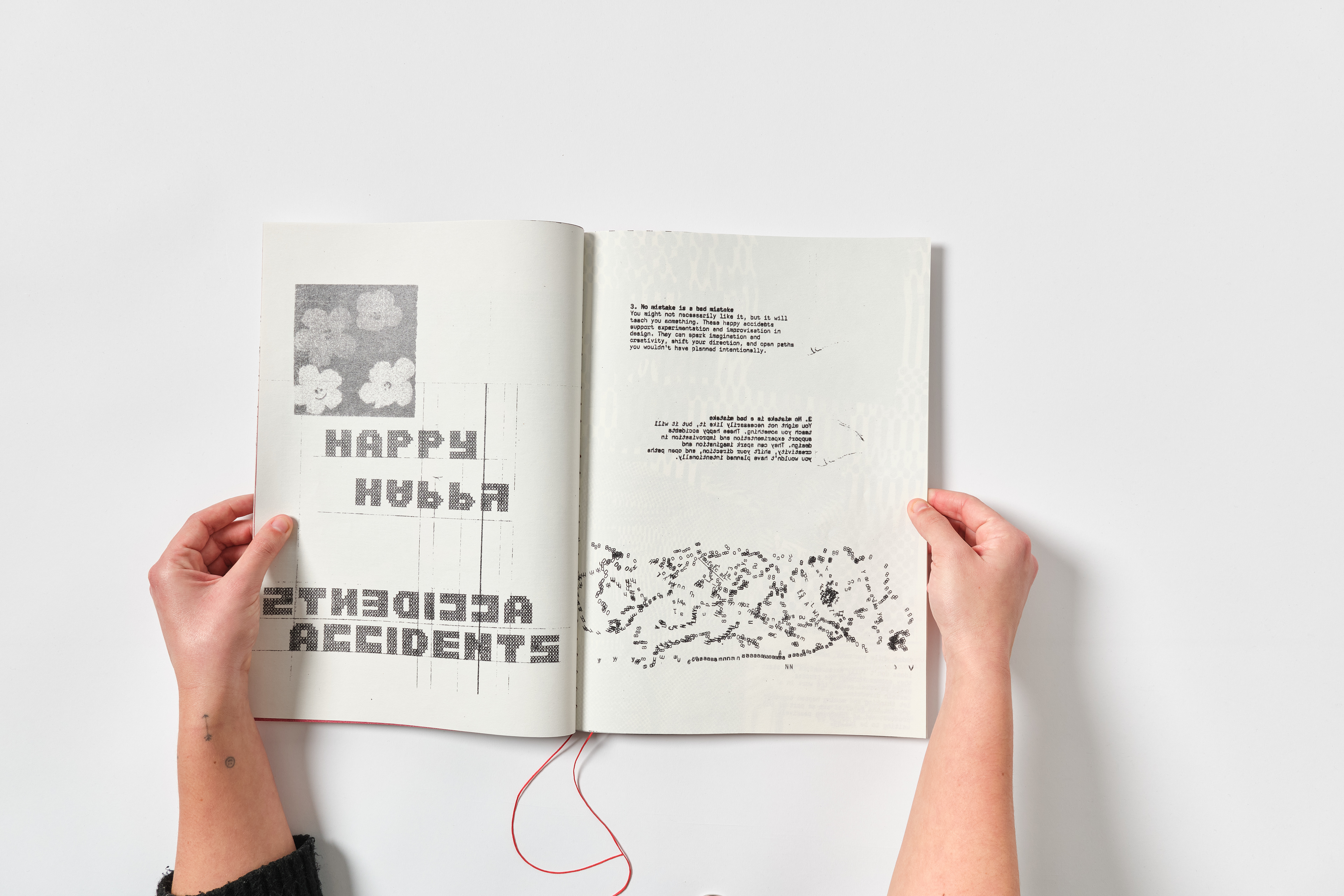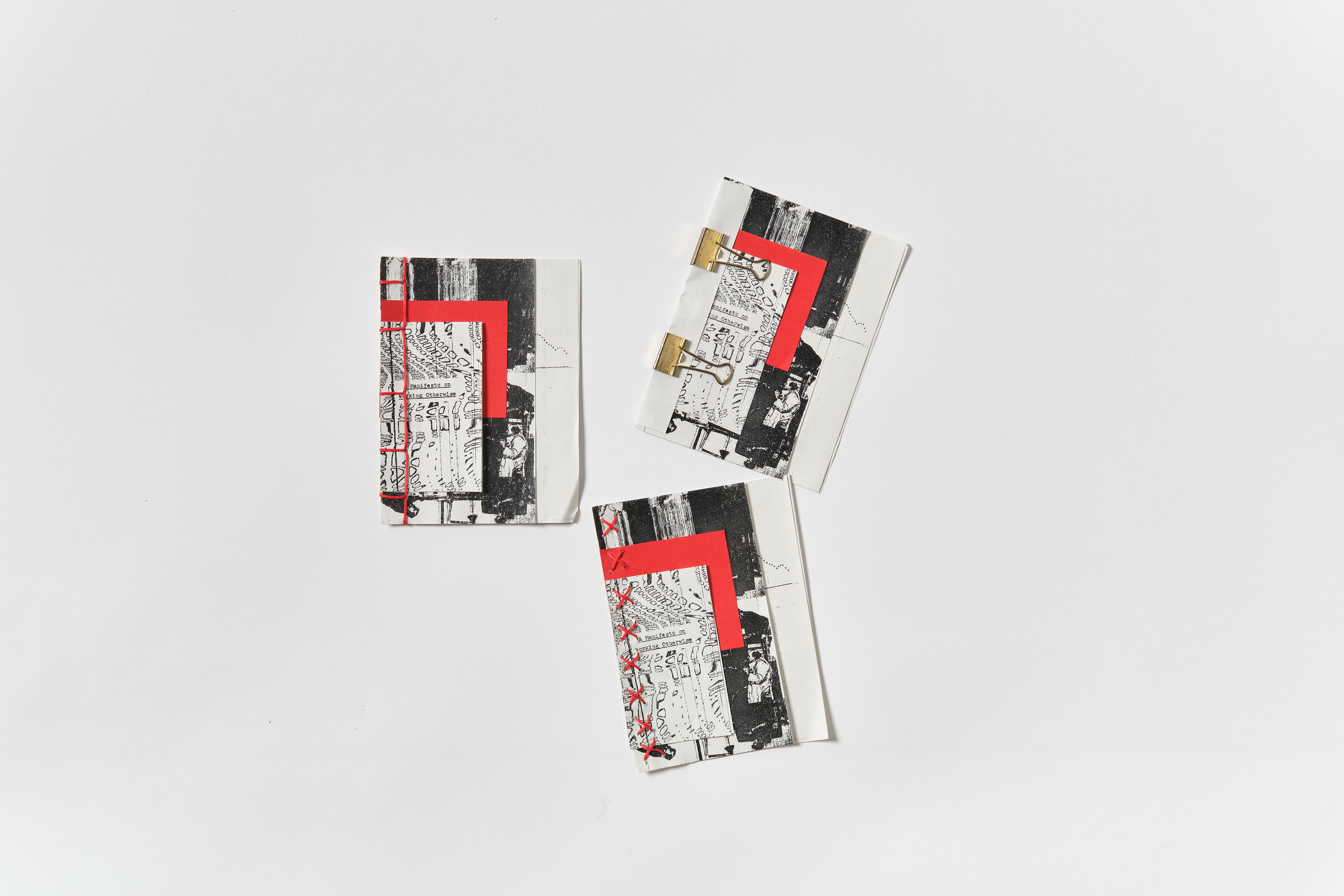 Keeping the hands-on-approach of the project, the pages were bound together manually, using the Japanese stab binding technique. The color of the thread connects to the color accent of the manifesto: red, the only additional color the machines could produce besides black.