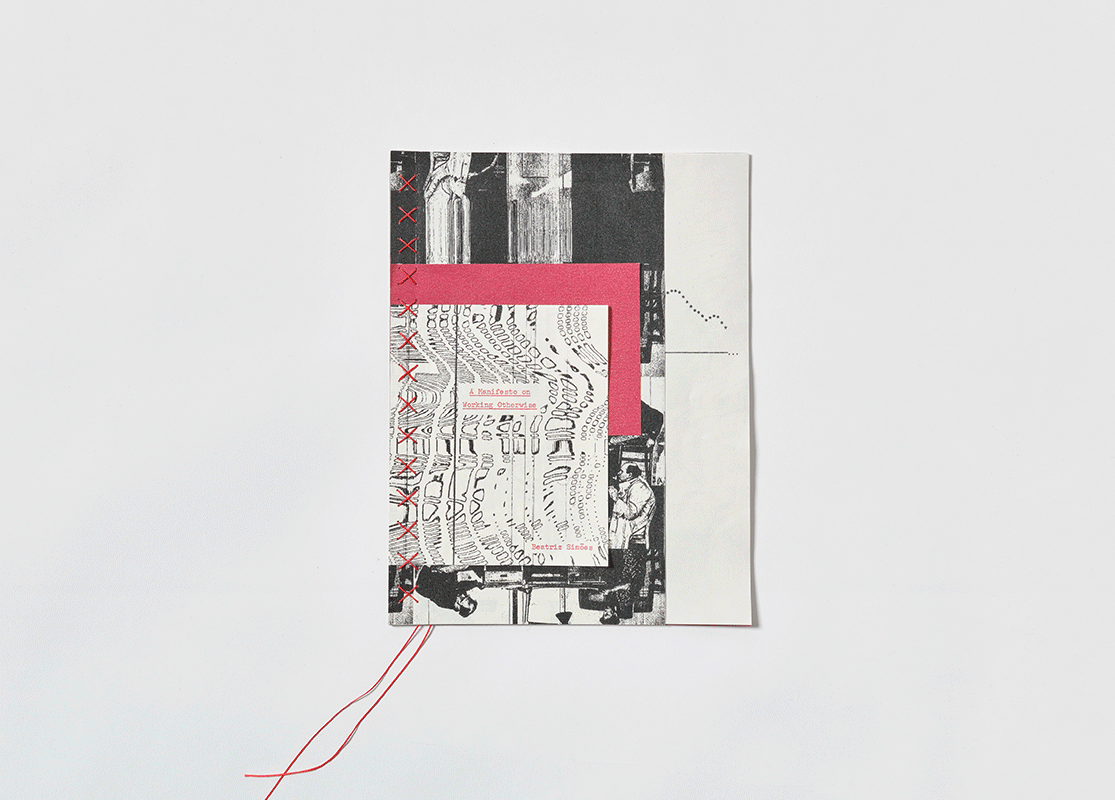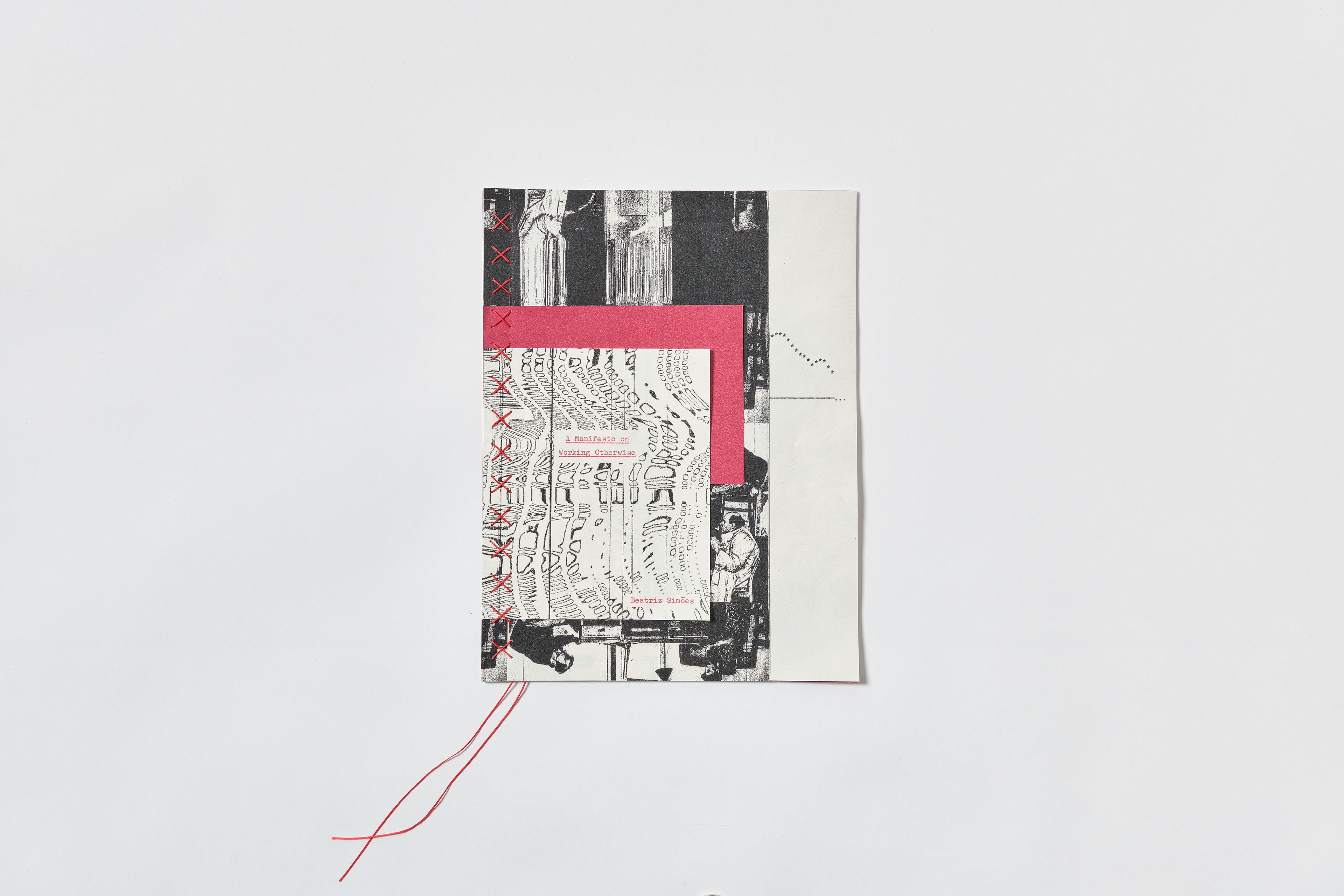 traces of the making process, presenting different formats and forming a composition. Adding a conventional cover would hide this, which reveals the manifesto as something built gradually rather than presented as a closed object.